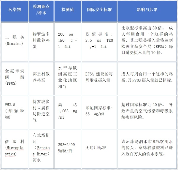 这些冰凉的数字背后,是令人的现实。演讲中最具冲击力的发觉之一,是将特罗波多村鸡蛋中的二噁英含量取越南边和(Bien Hoa)地域相提并论--后者是前美军空军,因储存过橙剂而成为地球上二噁英污染最严沉的地域之一。一个印尼村庄的日常食物,其毒性竟堪比一个污名昭著的化学和污染区,这无疑敲响了第一流此外警钟。